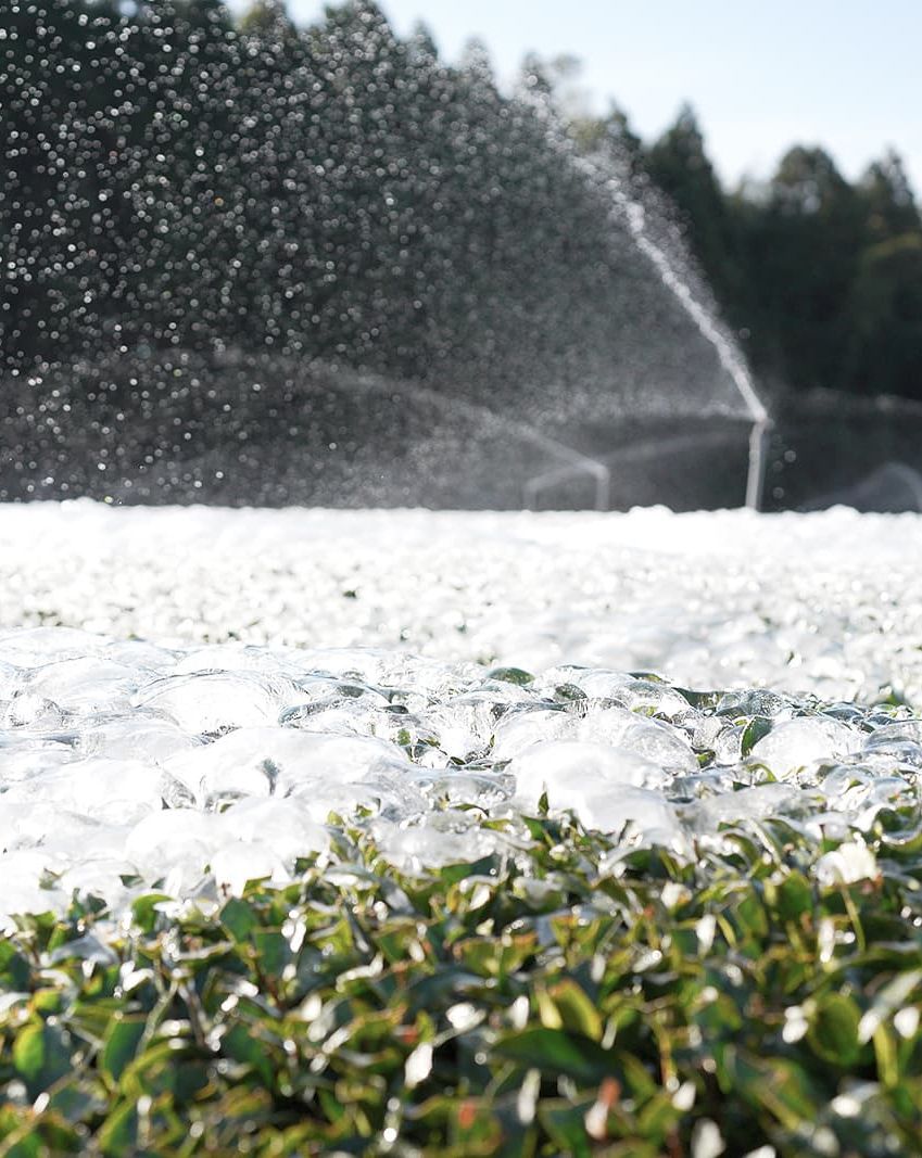 冬の茶畑と水まき