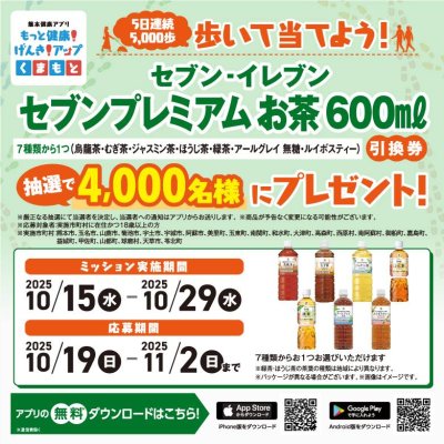 【熊本健康アプリ】5日連続5,000歩達成でお茶を当てよう!