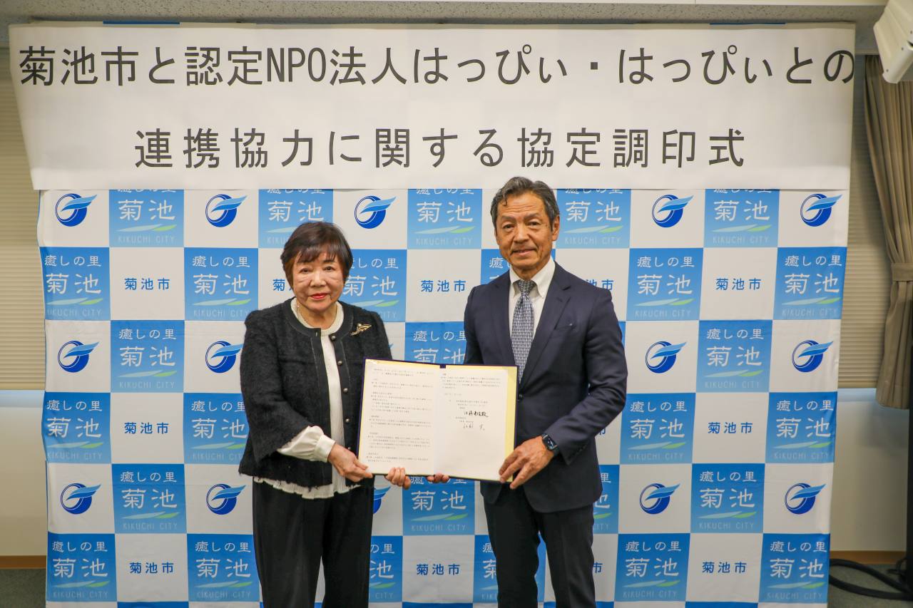 ホーム > 菊池市の概要 > 菊池市の紹介 > 各種協定 認定NPO法人はっぴぃ・はっぴぃと連携協定を締結しました 2025年11月17日 令和7年11月12日(水)菊池市役所本庁舎において、結婚・婚活支援などに関する取組を通じて、菊池市の人口増加に寄与することを目的として、認定NPO法人はっぴぃ・はっぴぃと連携協定の締結を行いました。連携する事項結婚・婚活支援に関すること。広い世代の結婚に対する機運の醸成に向けた取り組みに関すること。その他2者が協議して必要と認める事項。(左から、認定NPO法人はっぴぃ・はっぴぃ 江藤 南美枝理事長、江頭市長)