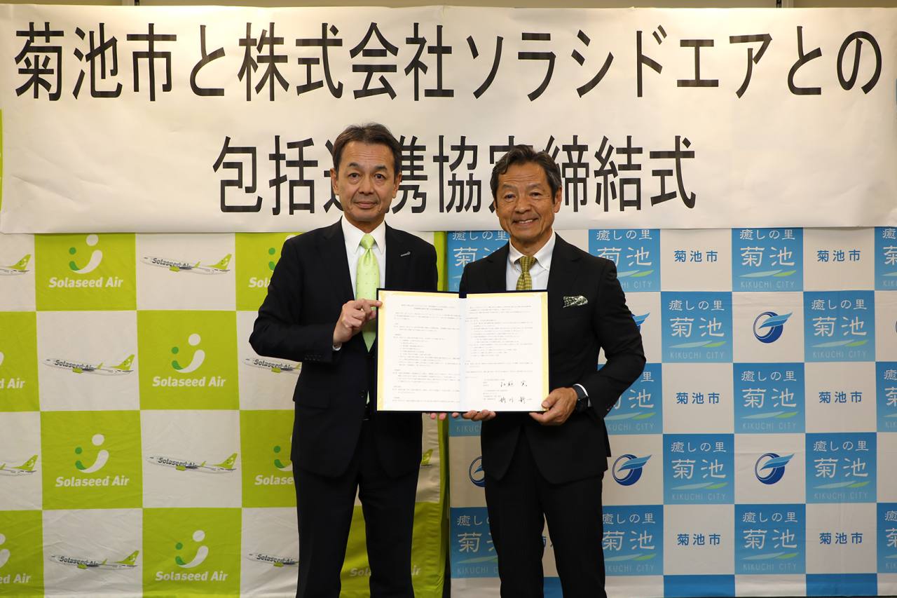 令和7年12月2日(火)菊池市役所本庁舎において、連携を通じて、地域課題に迅速かつ適切に対応し、菊池市の更なる発展に向けた取組みに資することを目的として、株式会社ソラシドエアと連携協定の締結を行いました。