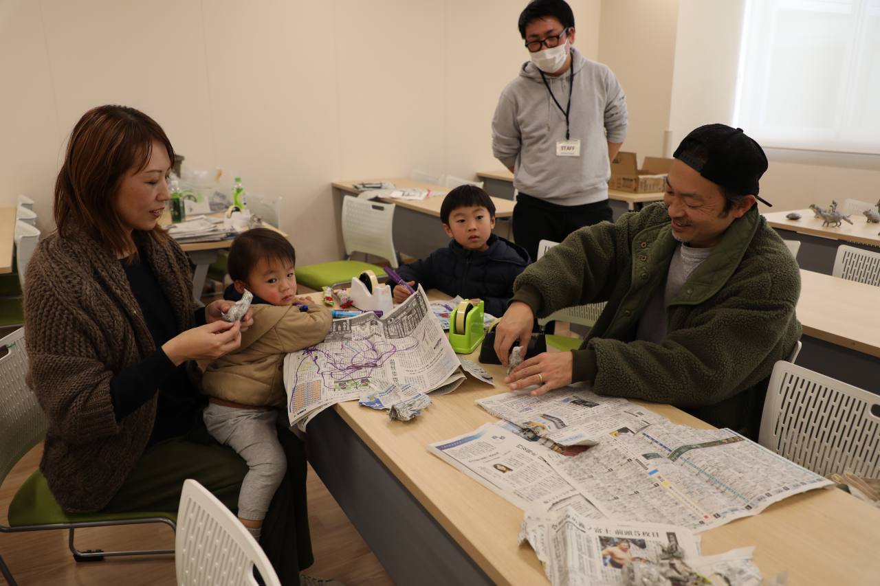 元・菊池市地域おこし協力隊の東 耕平さんが教える、大人気の新聞紙アート。特別な道具は使わず、新聞紙とテープだけで誰でも自由に表現できるワークショップに、多くの親子連れが参加しました。身近な廃材に新しい命を吹き込む、創造力とエコの心を育む時間となりました。