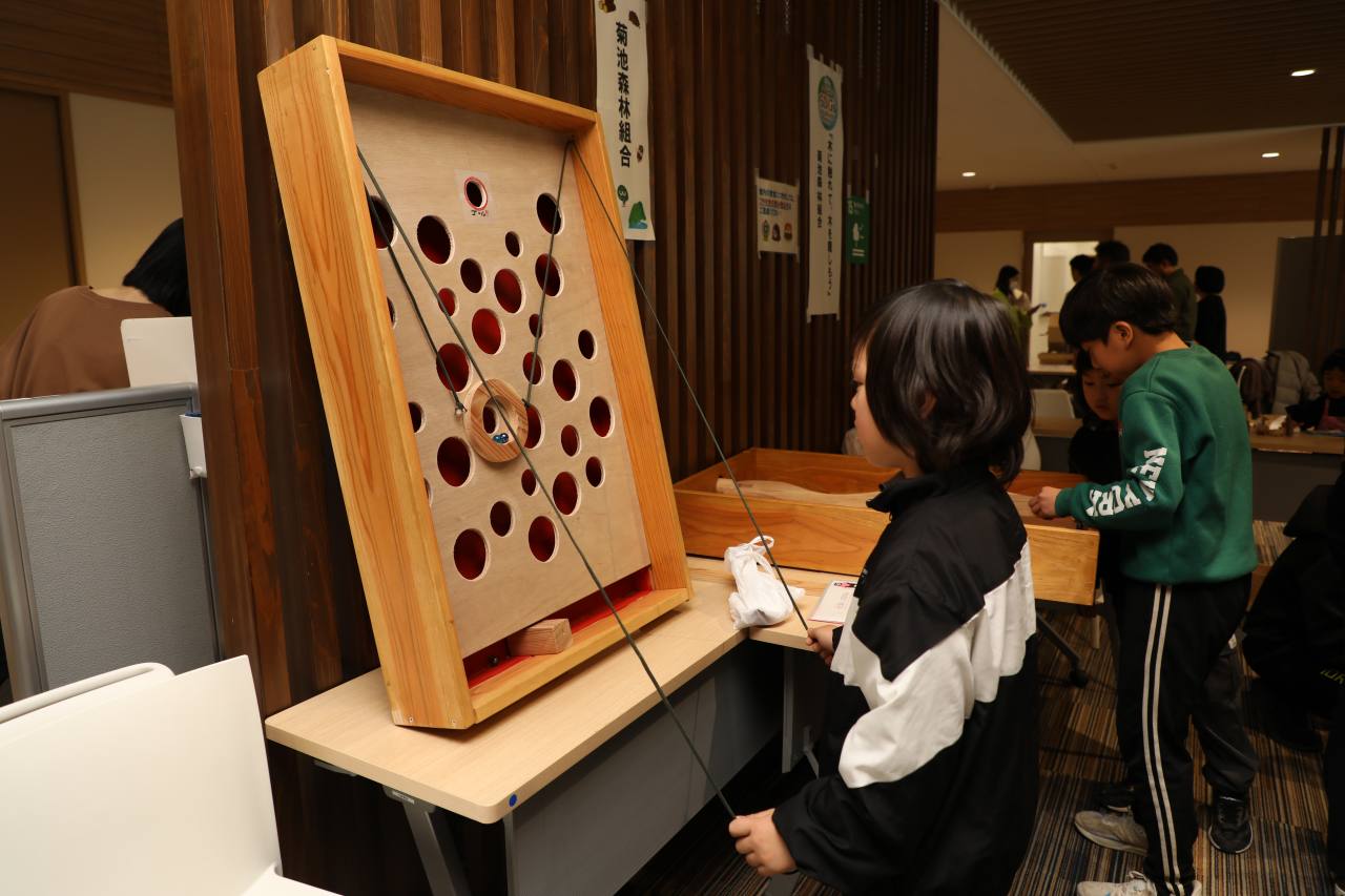 木の温かみや優しい香りを肌で感じながら、シンプルだけどなかなか難しいゲーム機に挑戦しました。子どもから大人まで、夢中になって遊びながら、地域の森林資源に親しむことができる心温まる空間でした。
