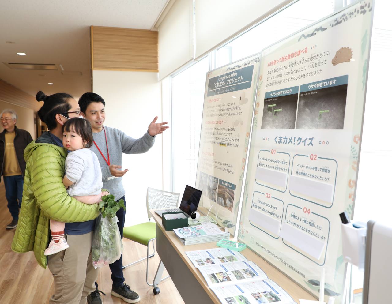 熊本県立大学と藤田区が協力して進める、カメラやAIを使った地域課題解決の取り組みを展示。スマホで川の様子や避難路の安全を確認できる仕組みや、AIで畑を荒らす動物を調査する最新の研究を紹介。テクノロジーで地域の安全と未来を守る、未来のまちづくりを発信しました。