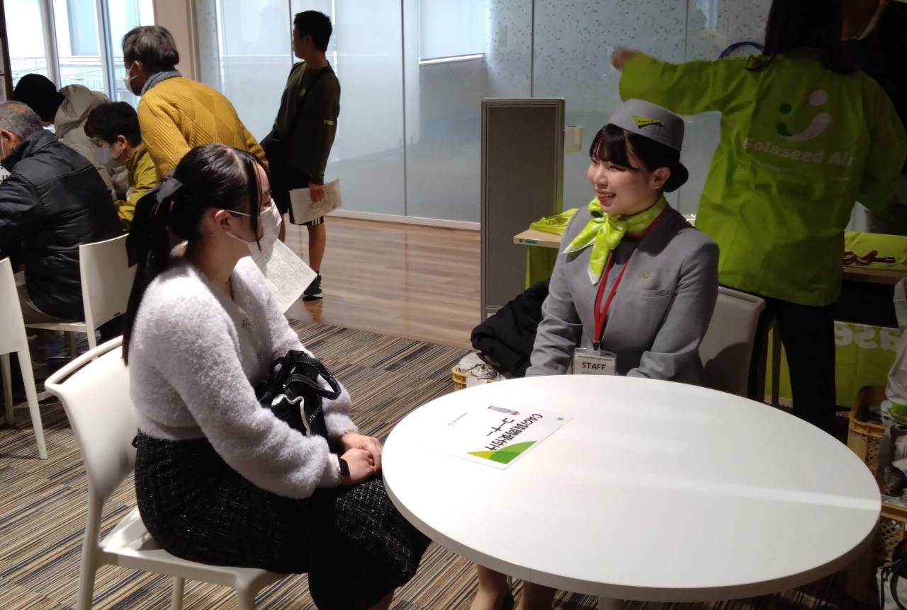 CAの仕事を知る質問コーナーと、耕作放棄地を再生して作った自社農園のさつまいも販売を実施。空と陸、両方から持続可能な未来を考えるきっかけを届けました。