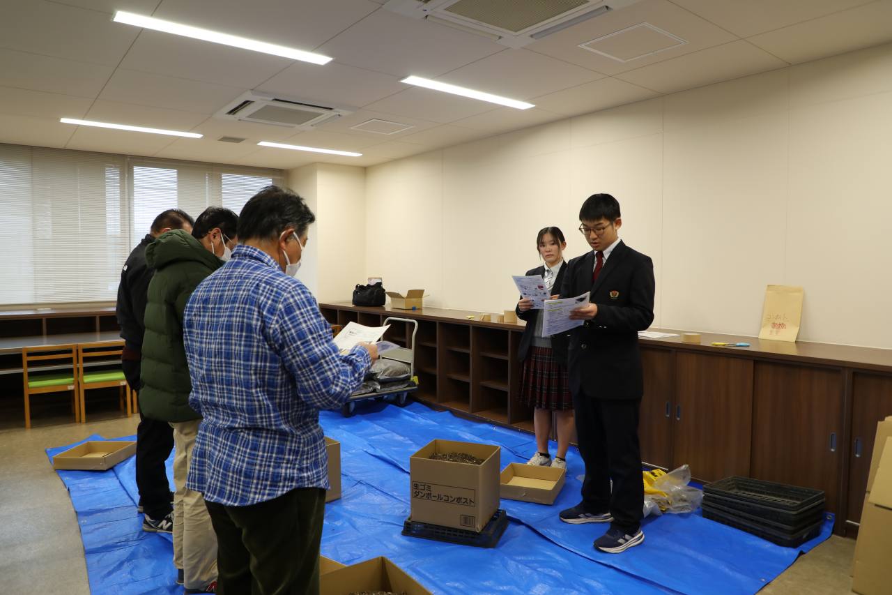 放置竹林の竹を粉砕したチップで生ごみを堆肥化する「段ボールコンポスト」の体験会。高校生自身が研究成果を発表し、体験講習会を実施しました。家庭でもすぐに始められるようキットの販売も行われ、地域の課題解決とごみ削減を市民とともに実践する頼もしい姿が見られました。