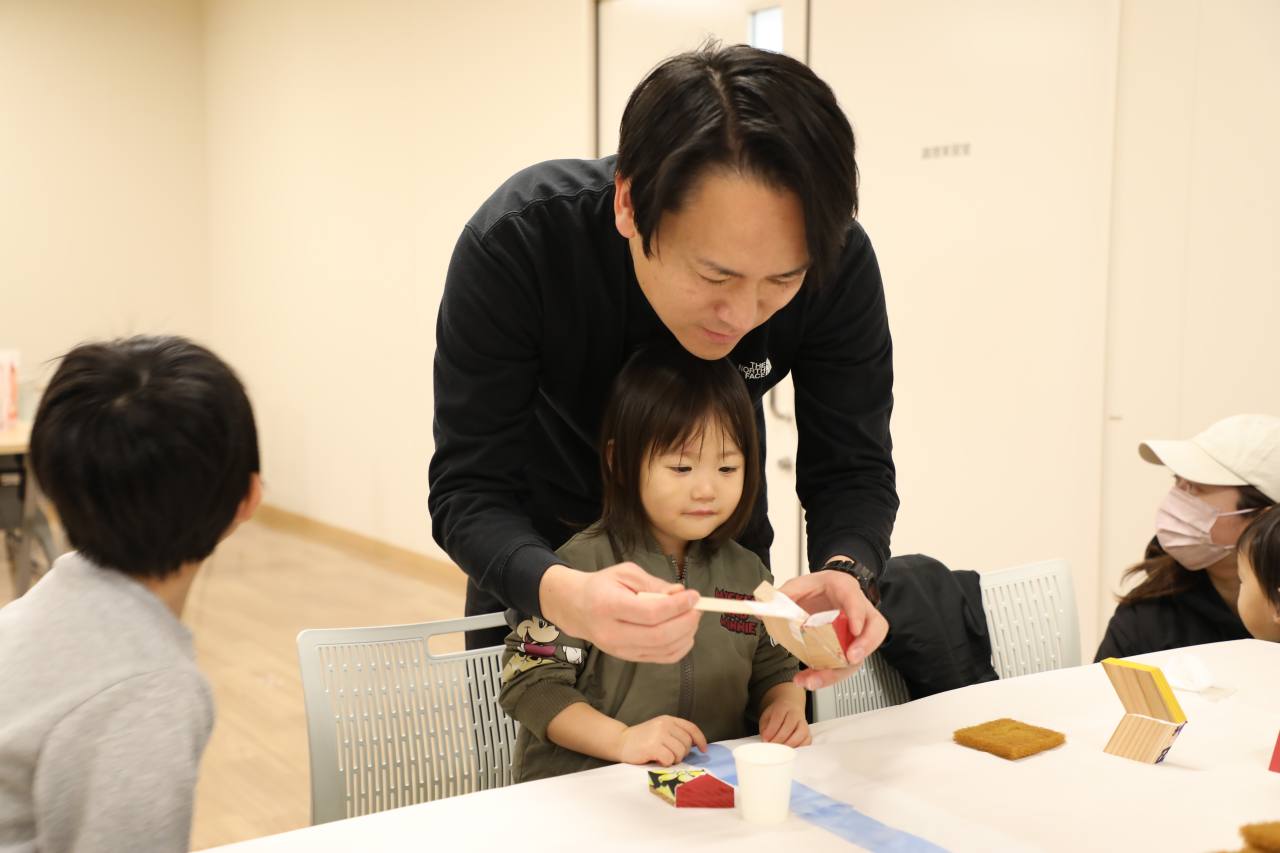 建築端材を使った工作ワークショップを行い、子ども達に大盛況となりました。また、地域ロス解消アプリ「かせする」も紹介。モノづくりと便利な仕組みの両面から、資源を大切にする心を学びました。