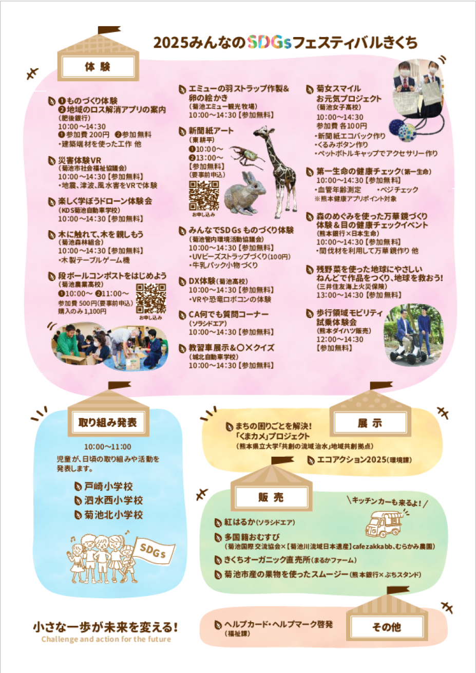 一般社団法人菊池青年会議所、菊池市、市教育委員会が共催し、SDGsにつながる市内の学校・企業・団体等 の特色ある取り組みを知ってもらうため、「2025みんなのSDGsフェスティバルきくち」を開催します!