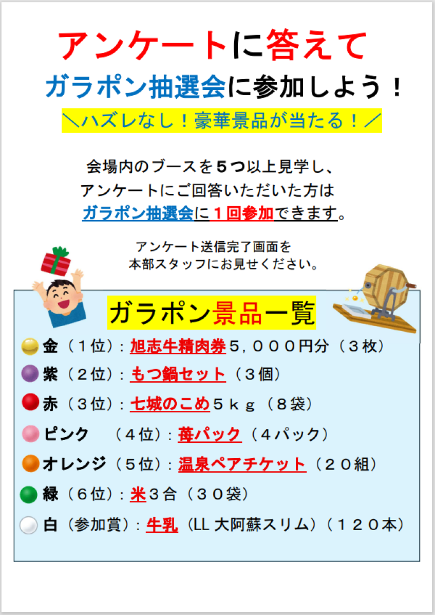 会場のブースを5つ以上見学しアンケートにご回答いただいた方は、ガラポン抽選会に参加できます。