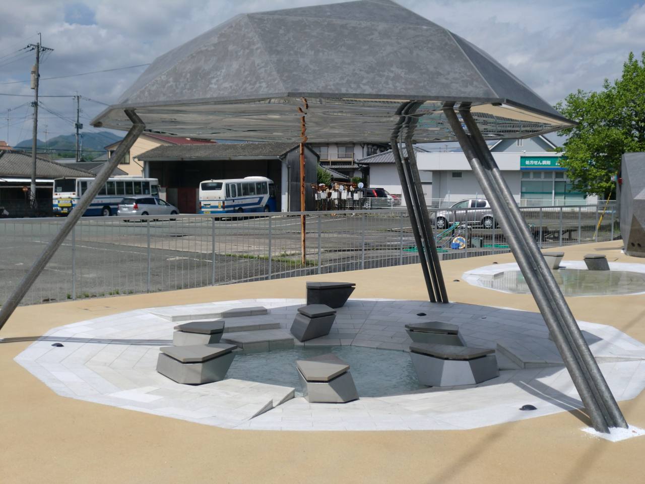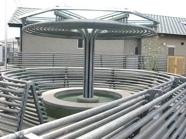 横町ポケットパークは「人の流れや交流」がテーマの公園で、丸パイプを曲げて積み上げたバンクが、足湯・トイレ・ベンチなどを形作りながら、人の動きや活動のガイドとなるように敷地全体に渦の模様を描いた公園になっています。
