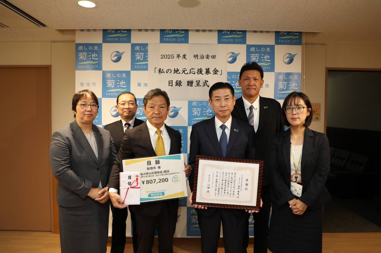 令和7年11月11日(火)、明治安田生命保険相互会社熊本支社 梅野勝義支社長と4名の関係者が来庁され、「地元の元気プロジェクト・私の地元応援募金」として、寄付金の目録贈呈式を執り行い、807,200円のご寄付をいただきました。
