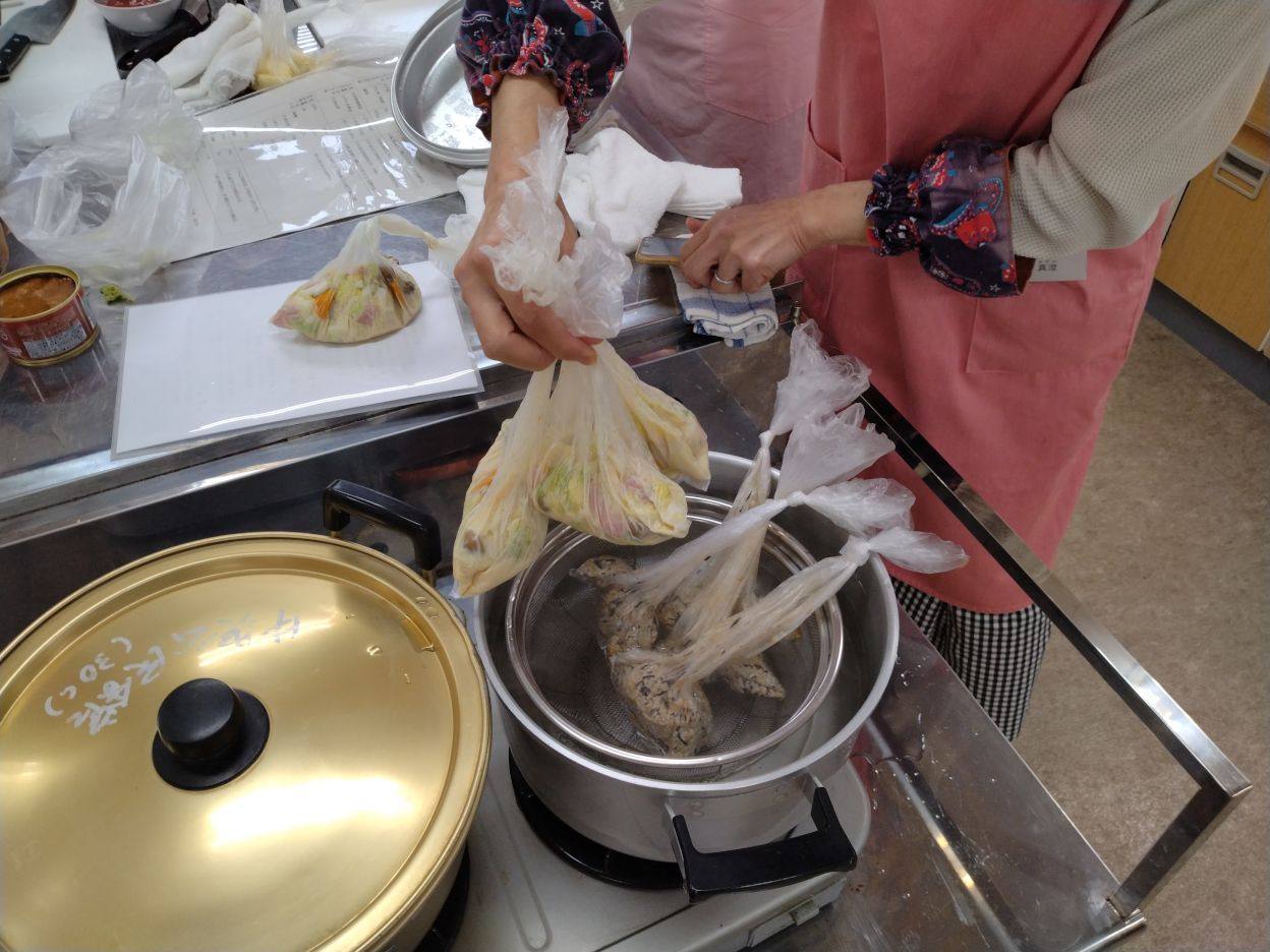 さらに「パッククッキング」の実演を通して、災害時でも安全に温かい食事を作る工夫を学びました。ポリ袋を使って湯煎調理を行うことで、食器を汚さず、限られた水を再利用できるなど、多くの利点があります。