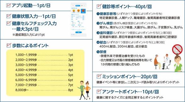 歩数によるポイントもあり、1,000歩ごとに1ポイント(1日8,000歩まで=最大8ポイント)が貯まります。さらに、健(検)診の受診でもポイントが付与されます。また、ミッションポイントなど、県内各地で開催される健康イベントに参加することでもポイントが獲得でき、楽しみながら健康づくりを続けることができます。