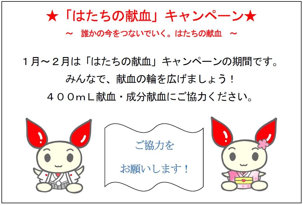 ホーム > 生活情報 > 健康・医療・戸籍・年金 > 健康・医療 > 献血 「はたちの献血」キャンペーン 2026年01月01日 献血者が減少しがちな冬期は、輸血用血液が不足しやすい季節です。このため、熊本県では1月~2月の2か月間、「はたち」の若者を中心に、広く県民の皆様に対して献血を呼びかけています。特に若い人たちで、献血をしたことがない方は、身近にできるボランティア「献血」に是非ご協力をお願いします。