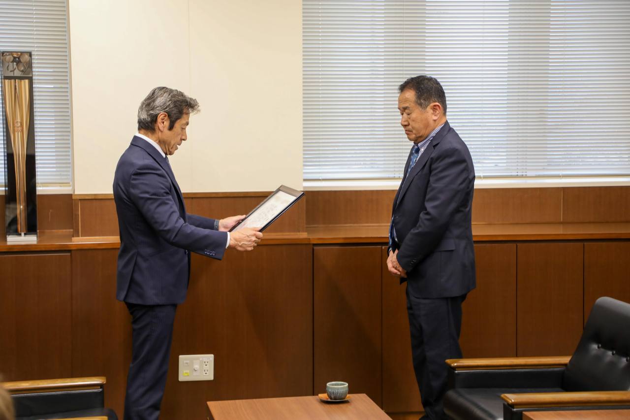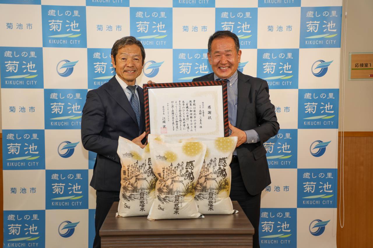 ホーム > 生活情報 > 妊娠・出産・子育て > 子育て > 子育て支援 有機米で、ひとり親世帯を応援(㈱有機農場 代表 高野三喜夫 様) 2026年03月04日 物価高騰の影響を特に受けている「ひとり親世帯の皆様を応援したい」と、(株)有機農場 代表 高野 三喜夫様から、有機米の寄付がありました。この有機米は、化学的に合成された肥料や農薬を一切使用しないことで、環境への負荷をできる限り減らした、有機農業で作られた安心・安全なお米です。 高野様のご厚意に対して、市から感謝状の贈呈を行いました。 ご寄付いただいた有機米は、市役所の窓口を通じて、ひとり親世帯の皆様へお渡しします。