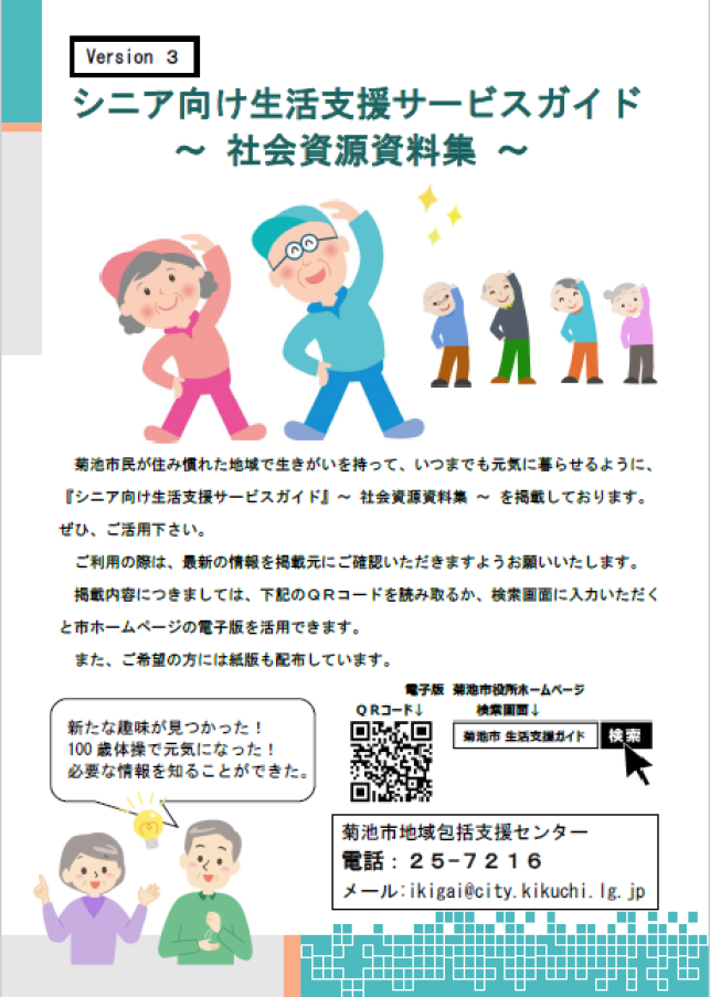 菊池市民が住み慣れた地域で生きがいを持って、いつまでも元気に暮らせるように、『シニア向け生活支援サービスガイド』 地域資源資料集を掲載しております。この度情報の更新を行いましたので、ご確認ください。
