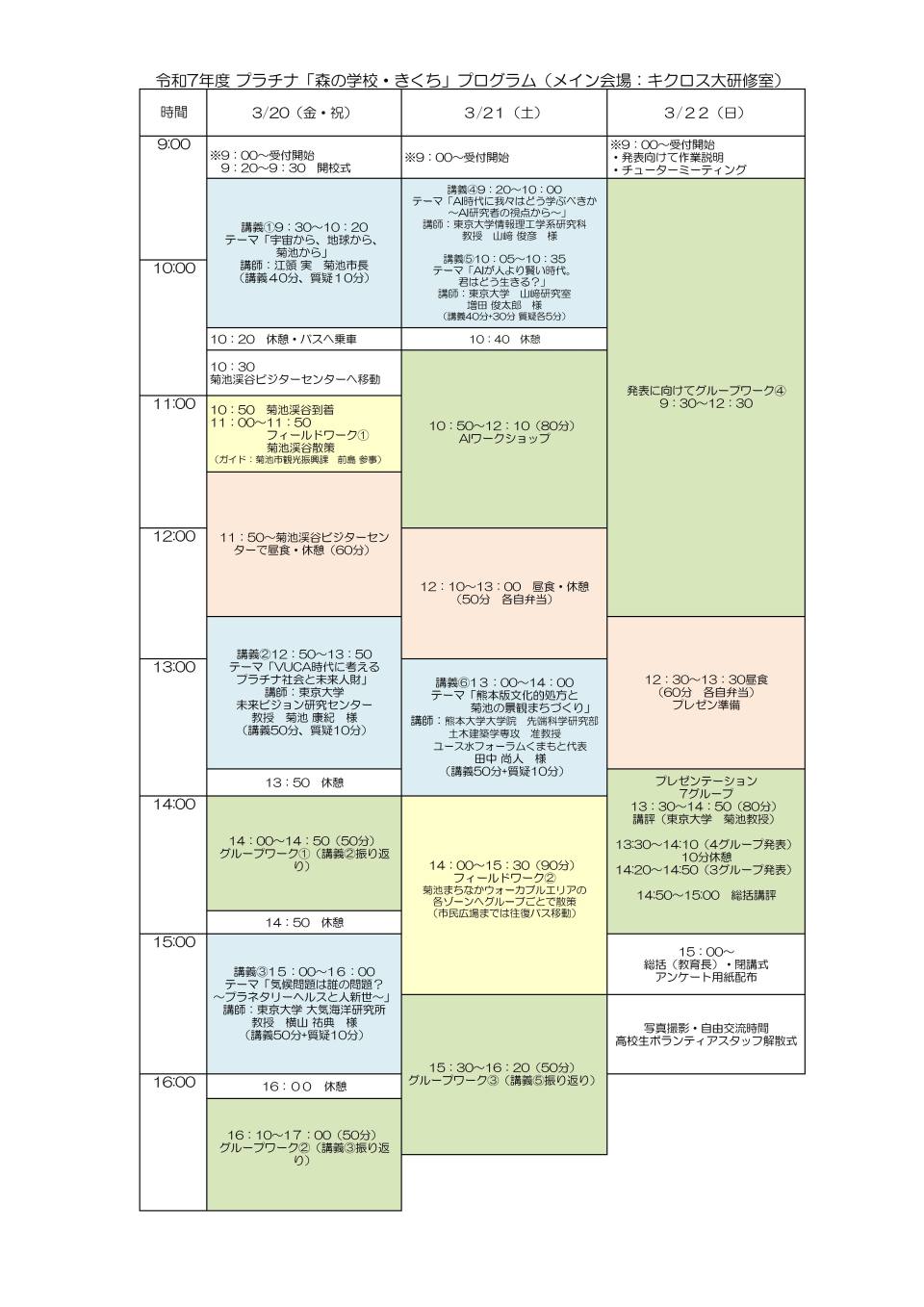 市内中学生34人、高校生ボランティア11人が参加し、中央公民館と菊池渓谷ビジターセンターを会場として講義を受け、菊池渓谷や隈府まちなかでのフィールドワークを行いました。東京大学未来ビジョン研究センターの菊池康紀教授とプラチナ構想ネットワーク事務局にご協力いただき、 国内外で活躍する講師による講話とフィールドワークを通して、多様な物の見方があることを学び、身近な地域や世界規模の課題をグループで話し合いました。