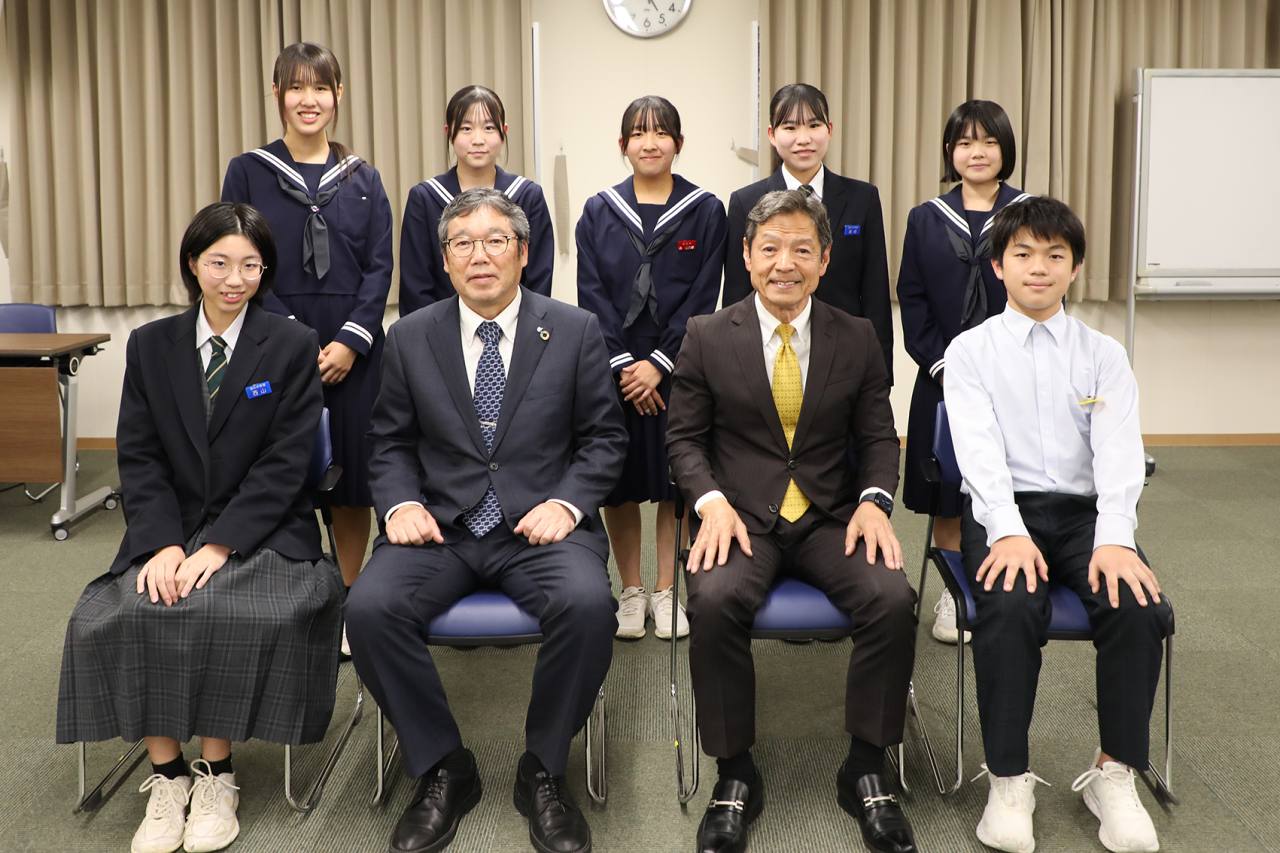 プラチナ未来人財育成塾に参加した生徒7名と江頭市長(中央右)、音光寺教育長(中央左)