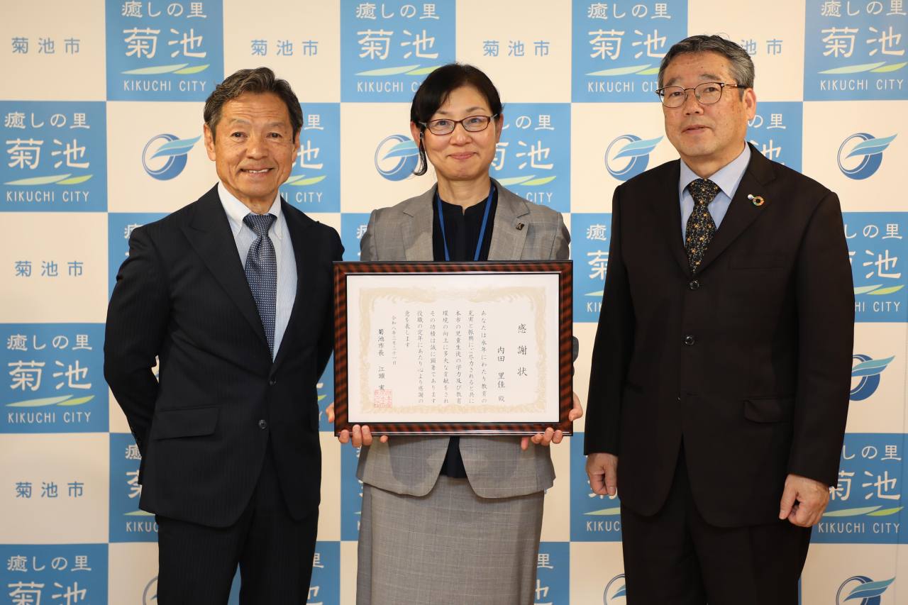 ホーム > 生活情報 > 教育・生涯学習 > 教育委員会 > 小中学校 令和7年度菊池市立小・中学校教職員退職校長への感謝状贈呈式(R8.3.30) 2026年04月08日 菊池市内の小中学校を3月に退職した校長先生に感謝状が贈られ、菊池市役所で贈呈式がありました。感謝状が贈られたのは、菊池北小学校の元校長、内田 里佳さんで、永年にわたる教育の充実と振興への尽力と、菊池市の児童生徒の学力と教育環境の向上に多大な貢献をされたことに対し、江頭市長からねぎらいの言葉と共に感謝状が手渡されました。 左から江頭市長 、内田 里佳さん(菊池北小)、音光寺教育長