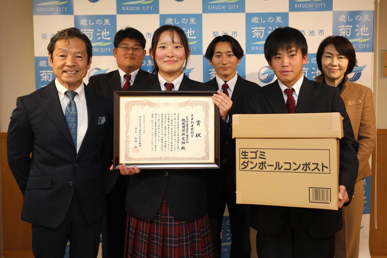 令和7年12月18日、菊池農業高等学校の生徒4人が、全国規模のコンクールにおけるダブル受賞、および竹資源を活用した新商品の販売開始とクラウドファンディングの挑戦について報告するため、表敬訪問をされました。