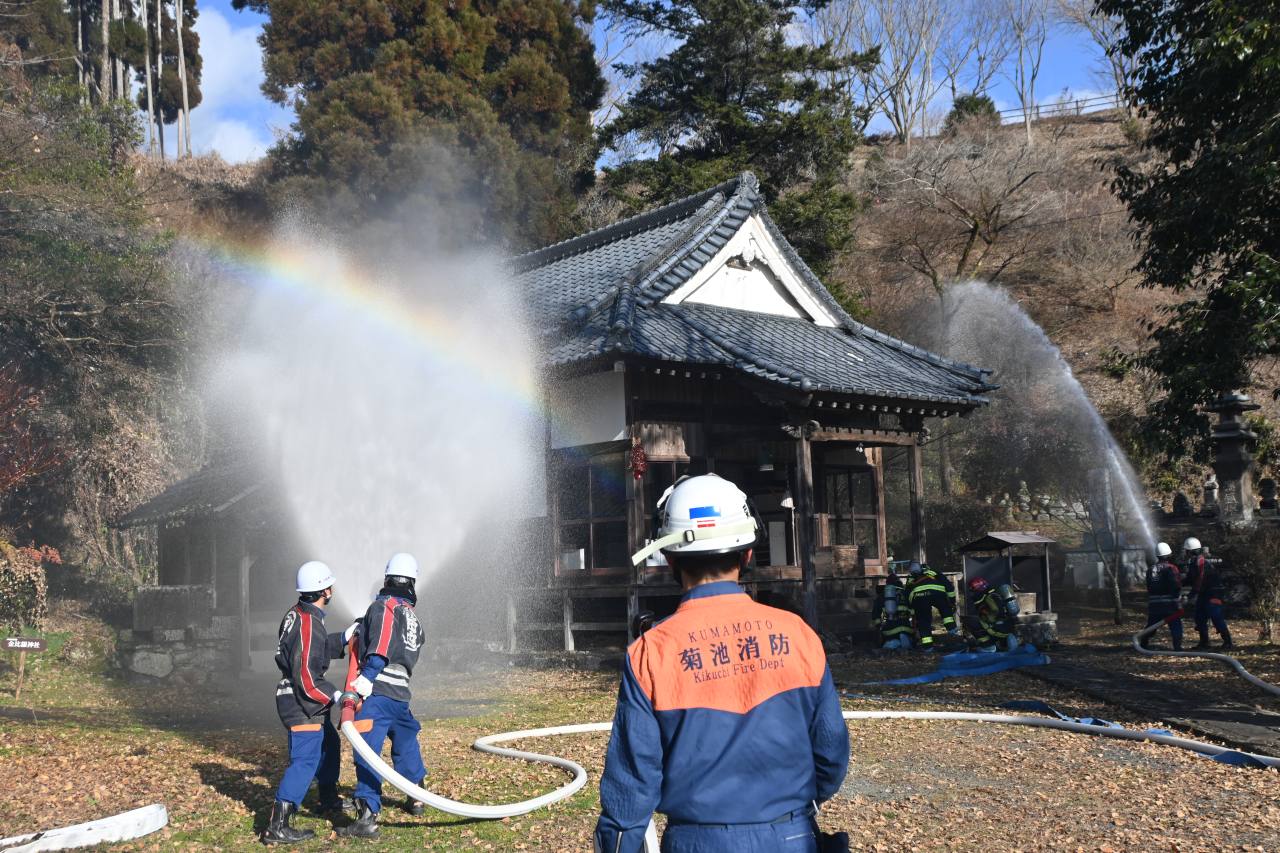 令和8年1月22日(木)、亘区の東福寺で、地域の皆さんの他、菊池広域連合北消防署、消防団による消防訓練が実施されました。