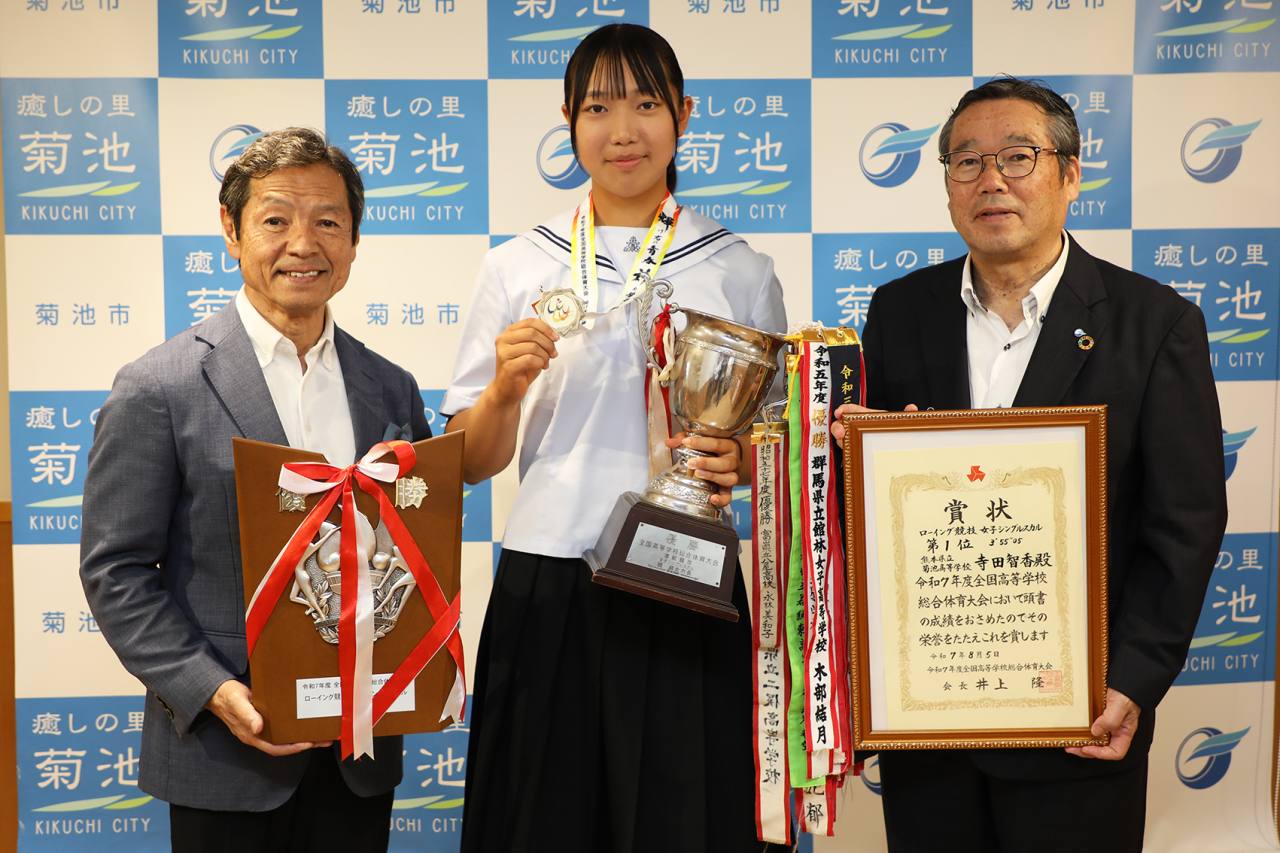 ホーム > 生活情報 > 教育・生涯学習 > 社会体育 > 地域スポーツ 寺田智香さんがインターハイのローイング競技で優勝されました! 2025年09月24日 寺田智香さん(菊池高校2年)が8月2日(土)~8月5日(火)に、広島県福山市水吞町芦田川漕艇場で開催された全国高等学校総合体育大会ローイング競技大会の女子シングルスカルで優勝されました。寺田さんは、「今後も大きな大会が控えているので、結果を残せるように頑張りたい。」と話してくれました。