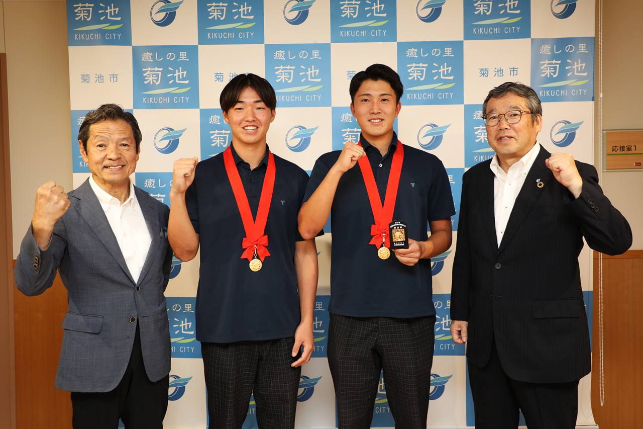 第107回全国高等学校野球選手権熊本大会で優勝し、8月5日から開催された第107回全国高等学校野球選手権大会に熊本県代表として出場された、菊池市出身の東海大星翔高校野球部の皆さんがその報告のため表敬訪問をされました。1回戦では、北海高校(南北海道)相手に10対7で甲子園初勝利の成績を残されました。