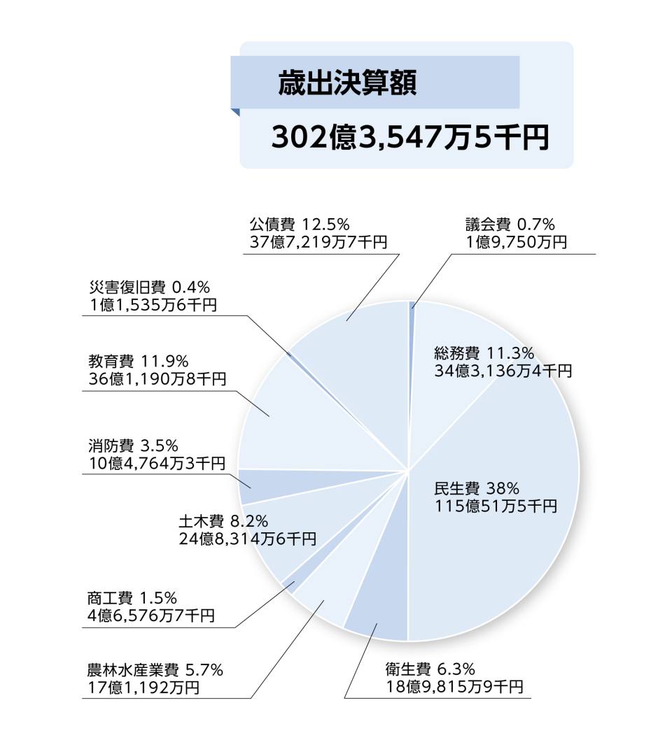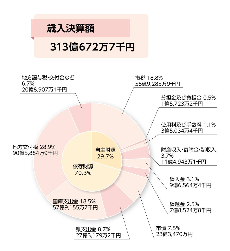 令和6年度の一般会計規模は、歳入313億672万7千円(対前年度比9.7%増)、歳出302億3,547万5千円(対前年度比9%増)で、歳入歳出の差額は10億7,125万2千円となっています。