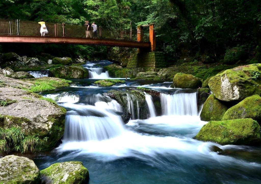 作品説明:渓谷に行ったら川の流れが綺麗で、橋の上を散策している人がいたので撮りました。