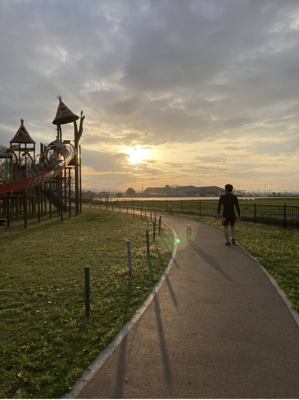 作品説明:夕方の散歩。綺麗な夕焼けの空を見ながら、散歩しています。お散歩大好き、お兄ちゃん大好き、鴨川公園大〜好き❤️と言ってそうです。今も毎日お尻フリフリで散歩を楽しんでいます。