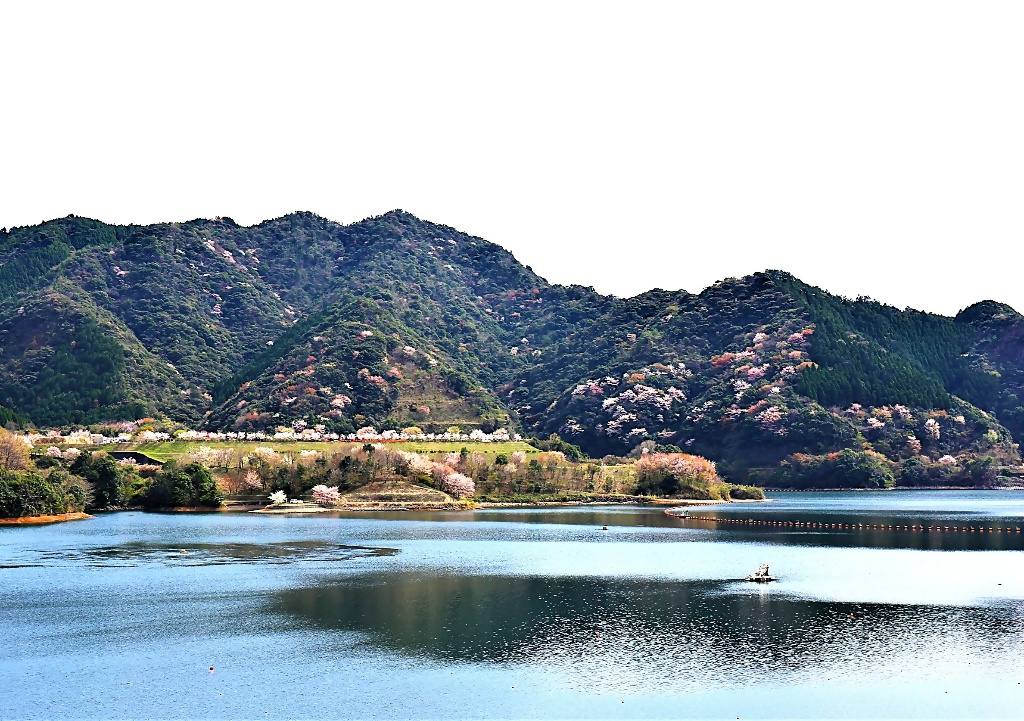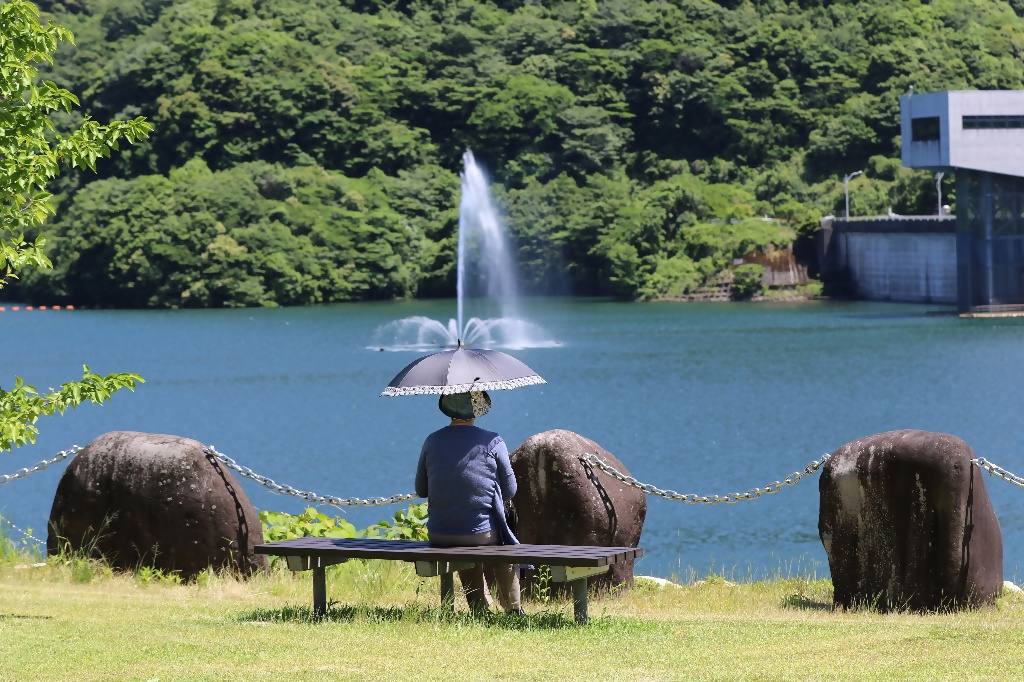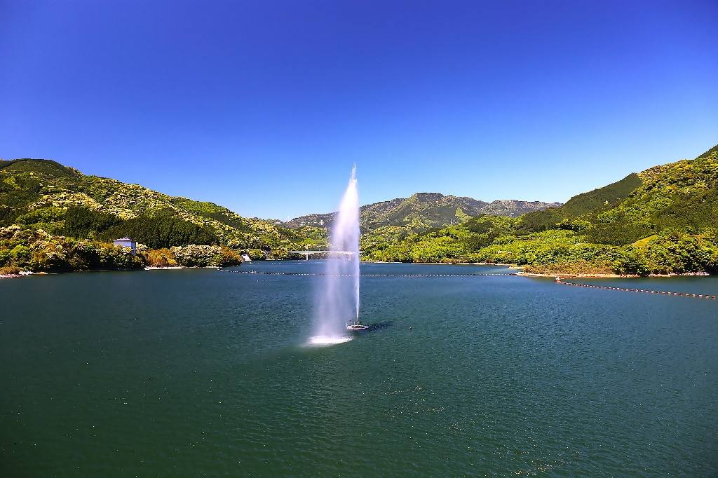 作品説明:竜門ダムに行った時、散策の途中ダム湖を眺めながら一休みしていると湖面から噴水が吹きあがりました。カメラを取り出し少し右少し左良しそこで動かないでと言いながら撮った一枚です。