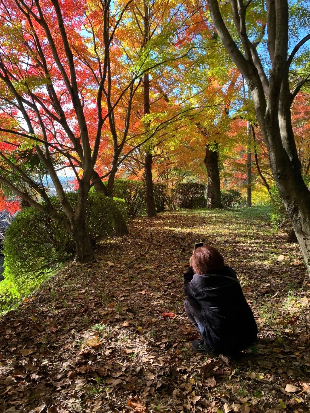 作品説明:菊池公園へ紅葉狩りに行った際、昨年見つけた萌えスポットに今年は家内を案内した。道の脇を一歩入っただけなのだが「たしかに超キレイだわ。スゴイキレイ」と座り込んでロウアングルで撮っているところです。細い空間が有って、紅葉した木々に覆われているシークレットスポット。ドヤ顔の私。