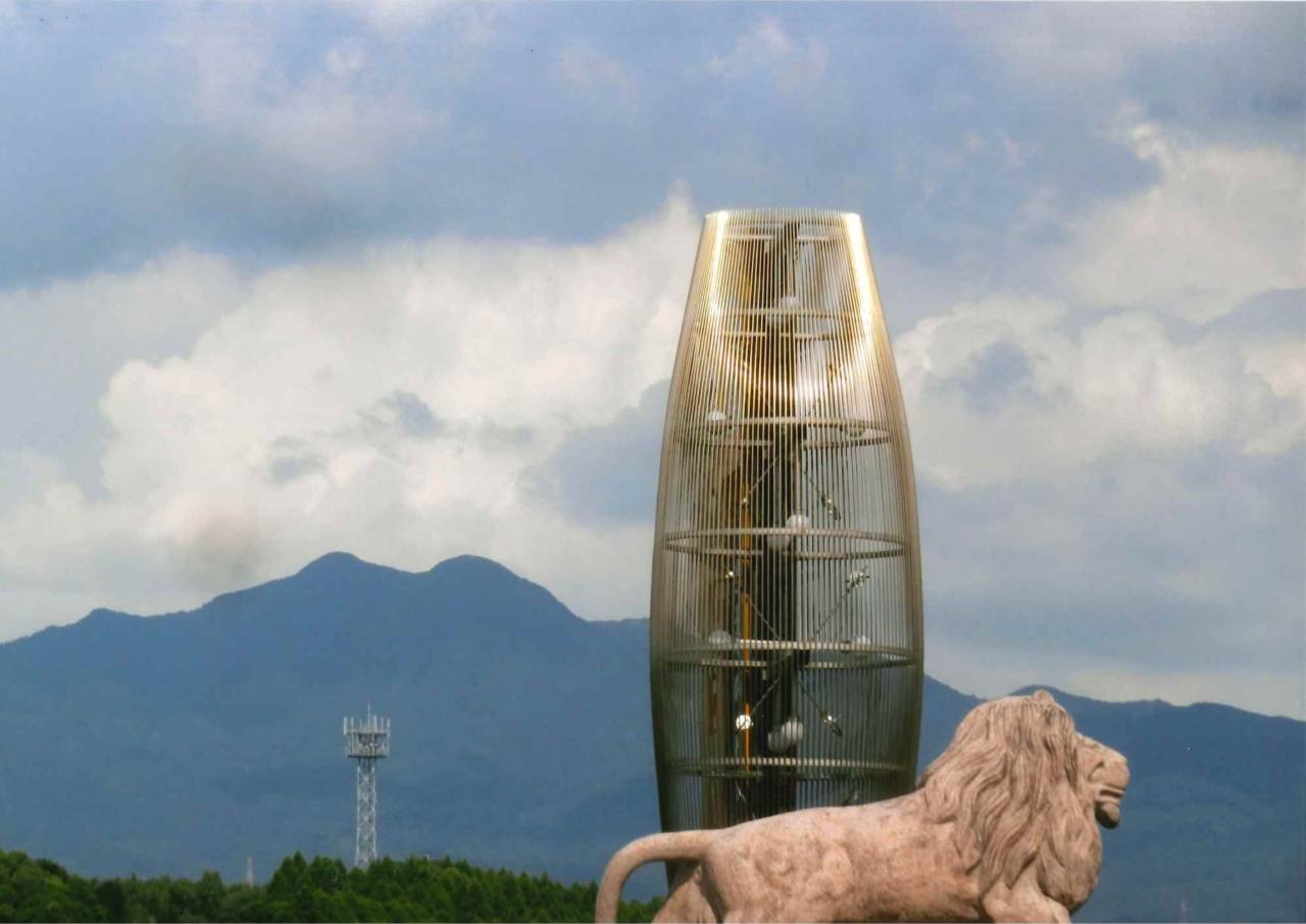 作品説明:生まれ故郷である菊池を幼少の頃から、ながめ、どんと、まるで頑張れと言ってるが如く、年令を重ねる程に、より、強く、感じる様になり、月1~2回は、車で登山口位まで訪れる、帰宅中、道の駅旭志に車止めた所に、ライオン像とその後に、夕日前に照り輝く、オブジェがマッチングしていた。
