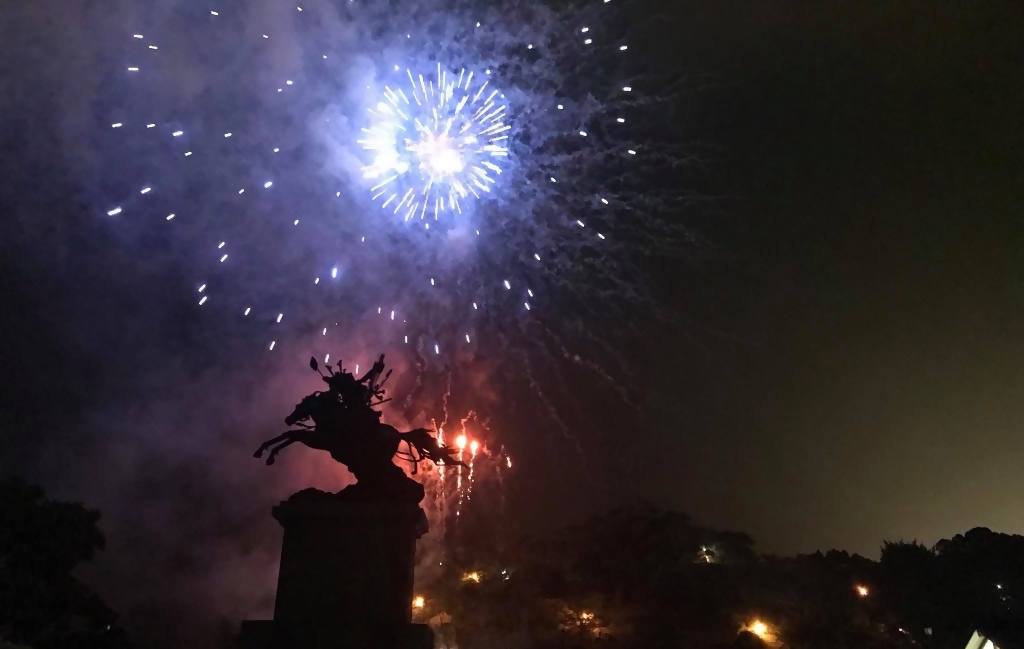 夜空に咲き誇る大輪の花火が、静かに佇むこの像に命を吹き込みました。
