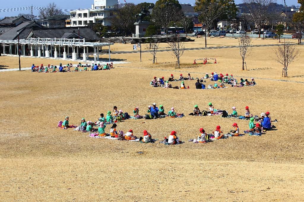 作品説明:菊池神社に参拝に行った時、菊池市ふるさと創生広場の芝生の広場に多くの幼稚園児たちが輪になってお弁当を食べている風景に出会いました。広々とした広場で楽しそうな声が広がっていました。