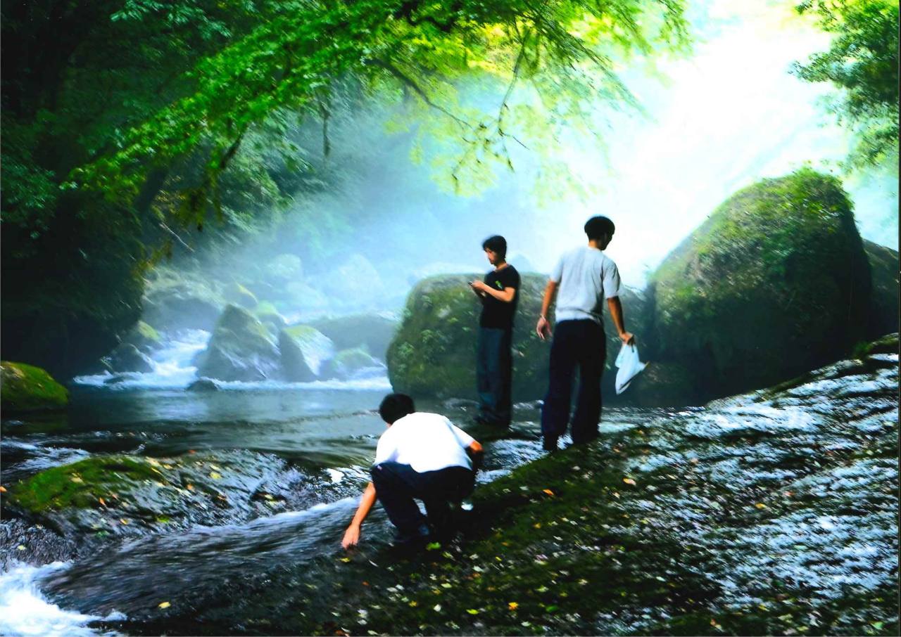 作品説明:清流に癒される渓谷。今日も天候不順にもかかわらず、多くの人が訪れていた。幸いにも雨も上がった関係で、ゆっくりと霧が立ち上がり、絶好の景色。たまたま、男性3人が川辺に下りて来た。チャンス。ねらい定めてシャッターを押す。