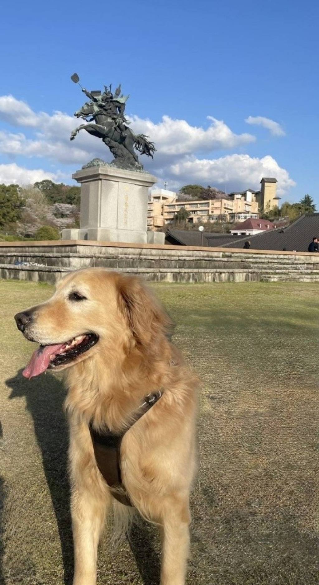 作品説明:散歩の途中で、勇壮な武光公とのツーショット。