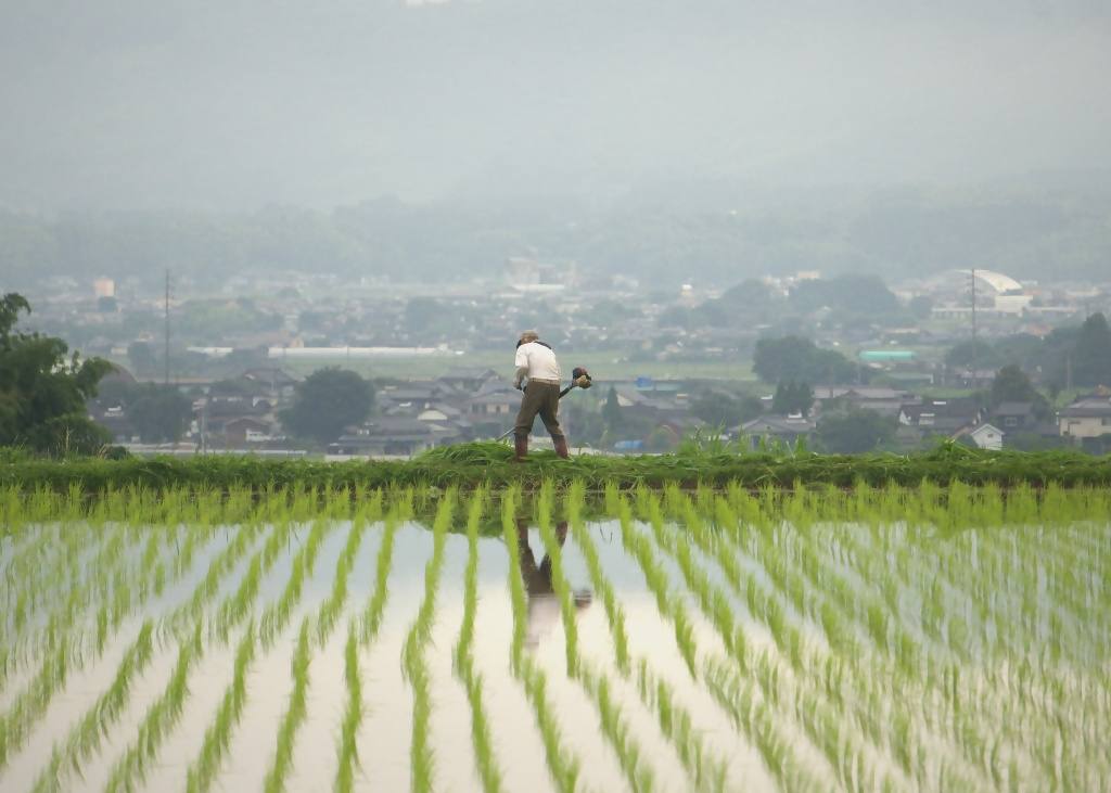 作品説明:遠くに街並みを見下ろす棚田  夏草を切り進んでゆく