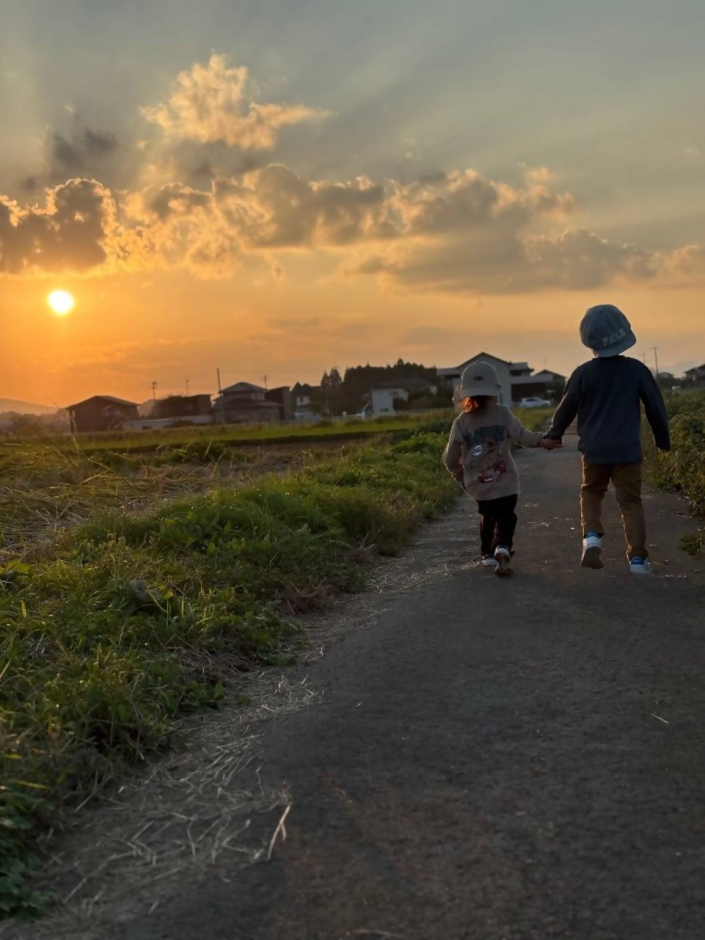 作品説明:夕方子供達と散歩に行ったときの一コマです。普段喧嘩もしますが…この日は兄弟仲良く歩いてくれて夕日の綺麗さも相まって"今"この瞬間が凄く尊く感じました。