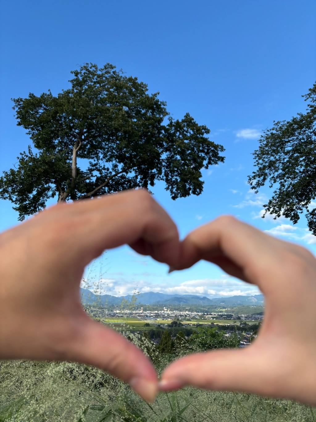作品説明:花房台展望所から望む菊池市の街並みと雄大な山々。澄んだ青空の下、手で作ったハートに未来を描き、新天地での暮らしの希望を込めて切り取りました。