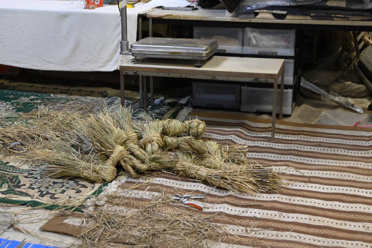 馬は藁で頭から胴部、尻尾まで作り、藁でできた胴部に竹を刺して足4本を作ります。虎口では子ども達がいる世帯において、毎年持ち回りで1戸の世帯の敷地に集まって作っています。前日13日に伺った際には、藁をねじり上げて頭から尻尾まで作製する作業を行っていました。