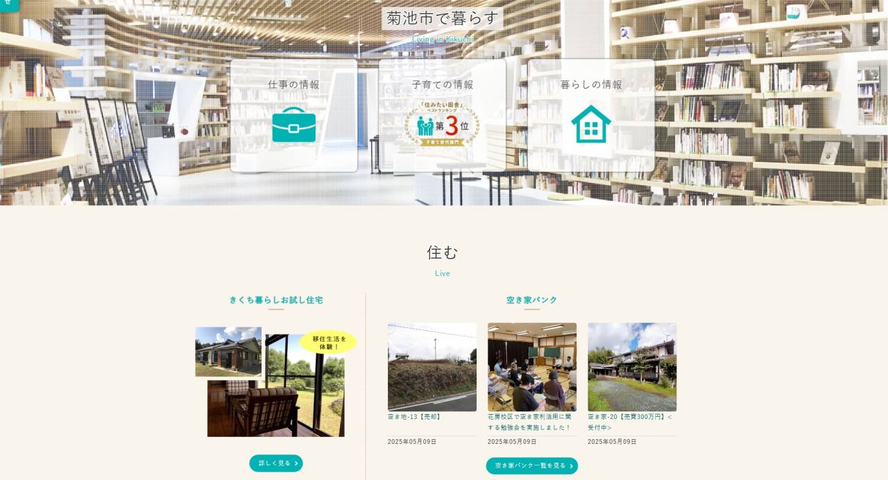ホーム > 移住・定住 > お知らせ 菊池市移住・定住のホームページをリニューアルします! 2025年12月10日 平素より本市の移住・定住ホームページをご利用いただき、誠にありがとうございます。このたび、より見やすく、使いやすいホームページを目指してリニューアルを実施します!新しいホームページでは、皆さまにとって必要な情報へスムーズにアクセスできるよう、構成やデザインを改善しております。今後も内容の充実を図ってまいりますので、引き続きよろしくお願い申し上げます。リニューアル日:12月25日(木) 13:00以降以下 リニューアルしたホームページのイメージなります。