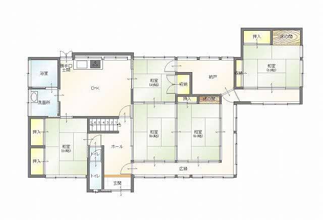 市役所から車で約5分のところにある6SDK古民家物件です。屋根付きの門をくぐっていくと石灯籠のある庭が広がっています。庭のすぐ横は菊池川が流れており川のせせらぎも聞こえます。玄関を入ると和室の続き間が広がっています。太く黒い梁(はり)や、竹格子の窓など日本建築の魅力も感じられます。庭には梅、栗、柿などの木があります。