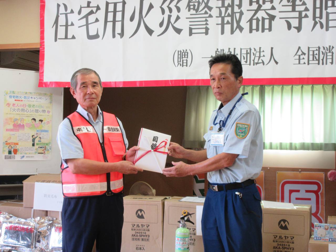 ホーム > 防災・安全情報 > 消防 河原地区に住宅用火災警報器等が贈呈されました 2025年10月01日 9月13日に中原公民館において、住宅用火災警報器等の贈呈式が行われました。河原地区では、各区で住宅防火講話や防災訓練等を継続して活動されており、高齢者を住宅火災から守ることを目的として、住警器等配布モデル事業実施地区に選ばれ、一般社団法人全国消防危機協会より贈呈されたものです。贈呈式後、地元の菊池市消防団第2分団の団員が高齢者宅を訪問し、住宅用火災警報器の取り付けを行いました。