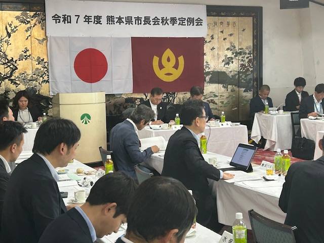 ホーム > 市長室へようこそ > 活動報告 (市長活動報告)令和7年度熊本県市長会秋季定例会 2025年10月07日 令和7年度熊本県市長会秋季定例会が開催されました!10月2日(木)、山鹿市の富士ホテルで令和7年度熊本県市長会秋季定例会が開催されました。定例会では、各市より提出された19議案の審議が行われ、うち5議案が九州市長会への提出議案として決定されました。また、定例会終了後には、菊鹿ワイナリーで行政視察と意見交換会が行われました。次回の春季定例会は水俣市で開催予定となっています。定例会の様子 菊鹿ワイナリーでの行政視察の様子 記念写真撮影の様子 意見交換会で乾杯を行う江頭市長