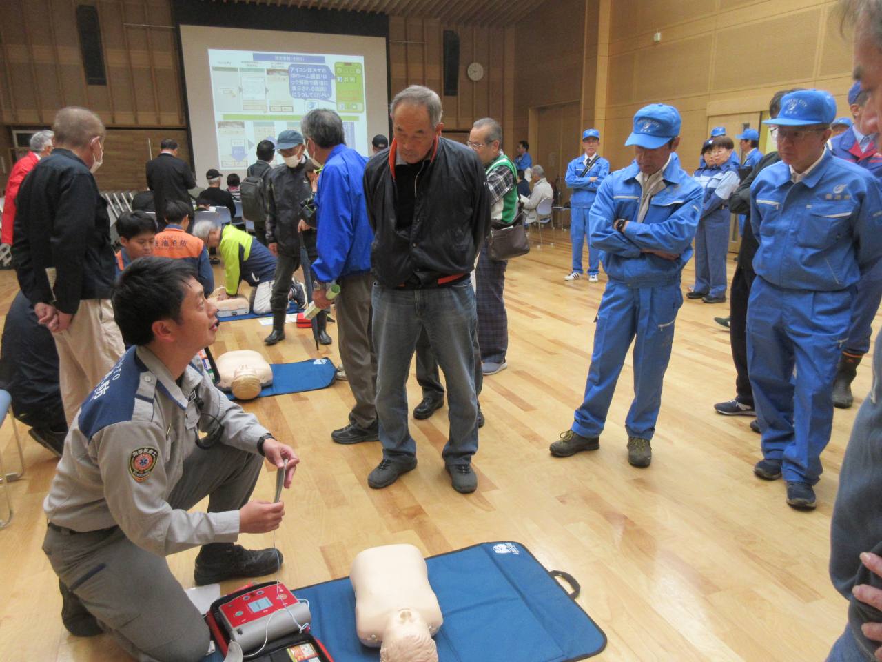 訓練では震度6強の地震発生を想定した避難訓練が行われました。また、泗水公民館では水圧扉開閉体験や心臓マッサージ体験のほか、避難所内の器材組立体験やカマドベンチを活用した非常食の配布などが行われました。