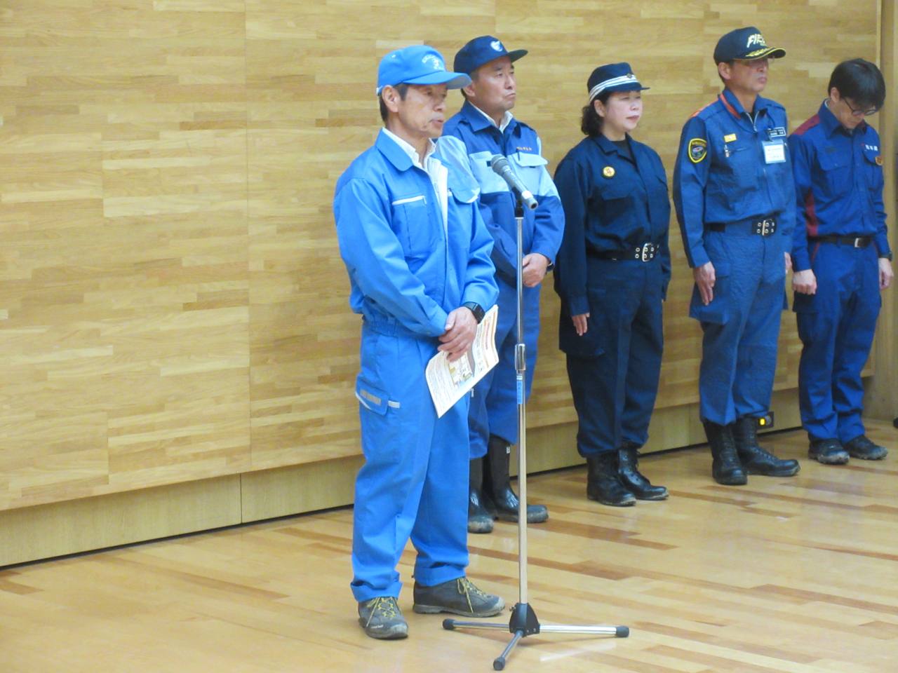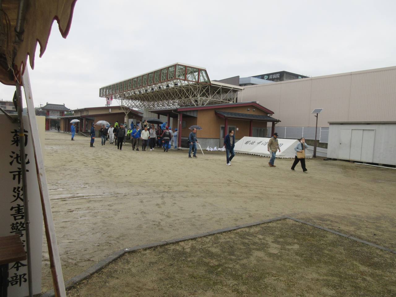 江頭市長は訓練後の講評で「本日は雨の中、またお休みの日にも関わらず、特に泗水地区から多数の市民の皆様、警察署、消防署、消防団など関係する全ての皆様にご参加いただき、無事訓練が終わりましたことを大変嬉しく思います。参加された皆様が自分事として真剣に取り組まれていた姿を拝見して心強く感じました。熊本地震から9年7か月経ちますが、昨年は元日から予想もしていなかった能登半島地震が起こったり、また30年以内には南海トラフ地震が約80%の確率で起こると言われており、菊池市でも震度5以上の被害が想定されています。起こらないのが何よりですが、いつ起こってもいいように備えることが必要であり、本日皆様が学んでいただいたことが有事の際の心の支えになると思います。市としましても、『強め・早め・多め』という合言葉で力を尽くしていきたいと思います。」と述べました。