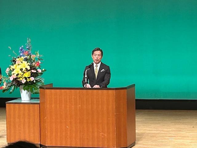 江頭市長は、「社会は大きく変化していますが、それをマイナスと捉えるのではなく自分の可能性を広げるチャンスだと考えてもらえればと思います。自分の思い描いている人生の設計図もあると思いますが、設計図にないことも人生にはたくさん起こると思います。枠にとらわれず、頭で考えるのではなく、とりあえずやってみるという気持ちと経験が大切だと思います。真っ白な自分の人生のページをどう描くかは自分次第です。より良い人生となるように大きく成長していただきたいと思います。そして、これまで愛情を注いでくれた両親や先生がた、地域の方々への感謝の気持ちを大切にしてください。」と式辞を述べました。