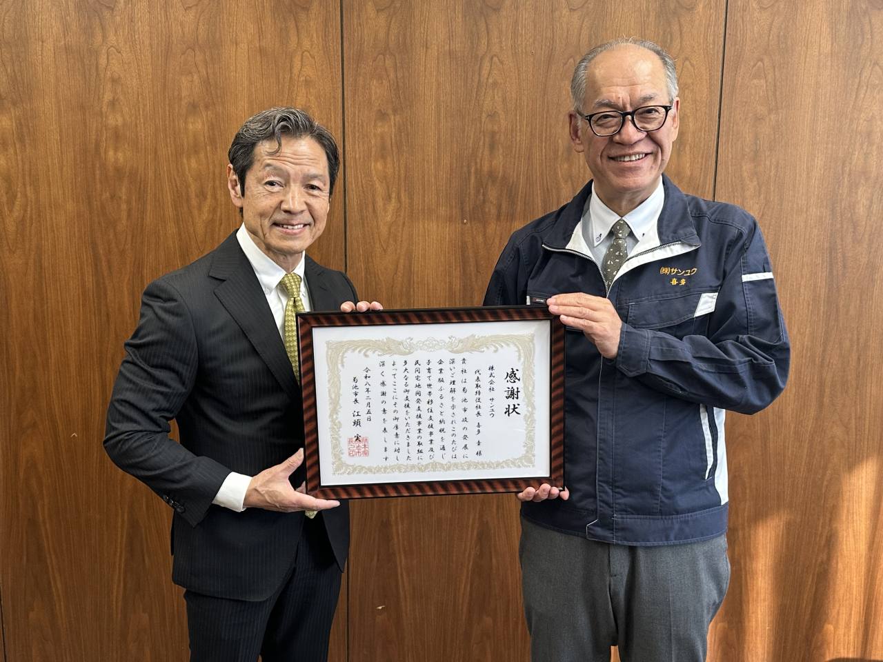 企業版ふるさと納税に伴う感謝状を贈呈させていただきました(株式会社サンユウ様)(R8.2.5)