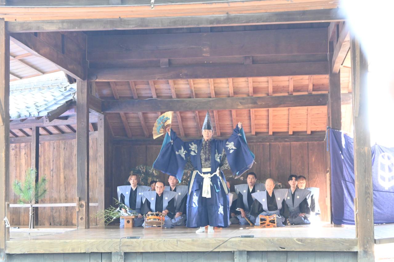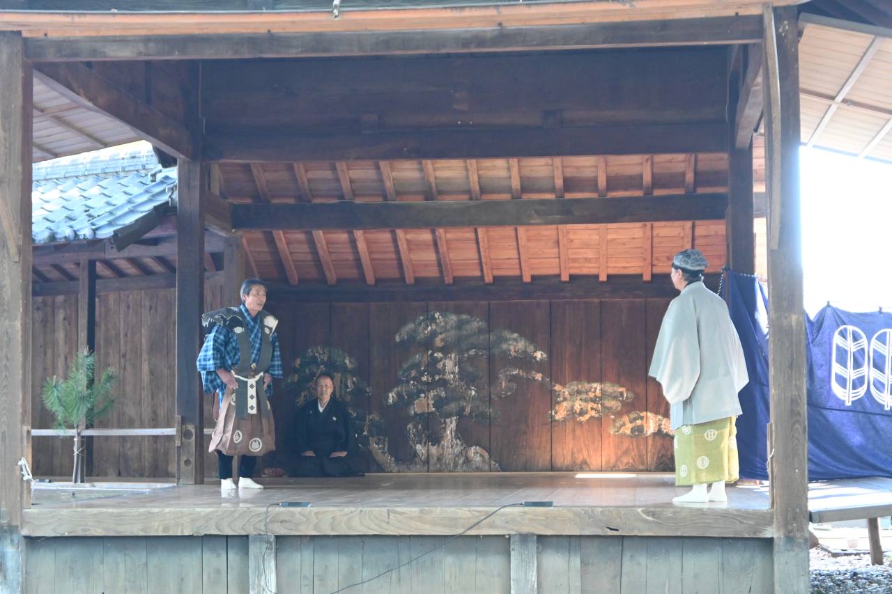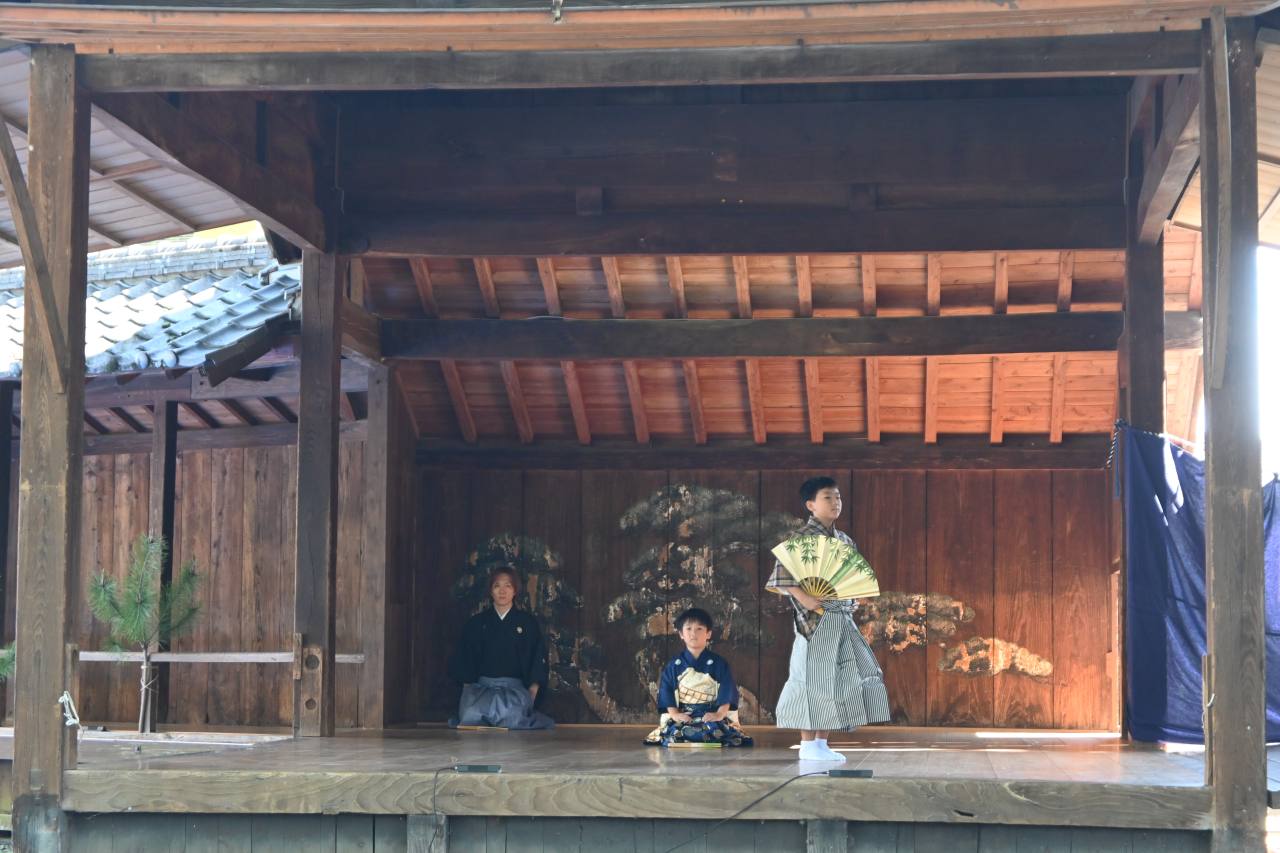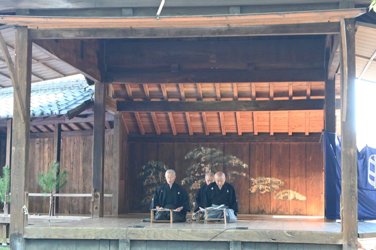その後菊池神社による神事が執り行われたあと、菊池高等学校前にある熊本県指定有形民俗文化財「菊池松囃子能場」で、御松囃子御能保存会による御能が奉納されました。