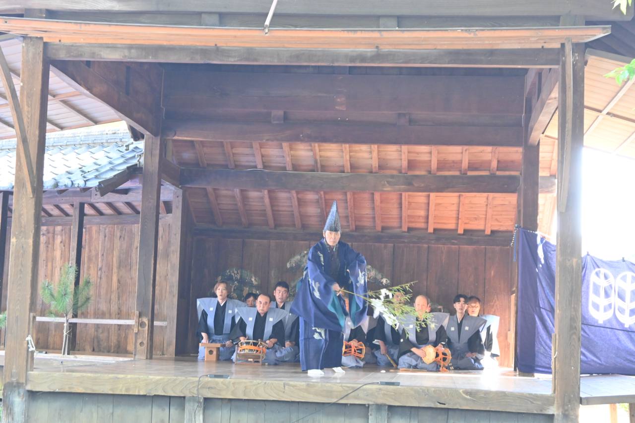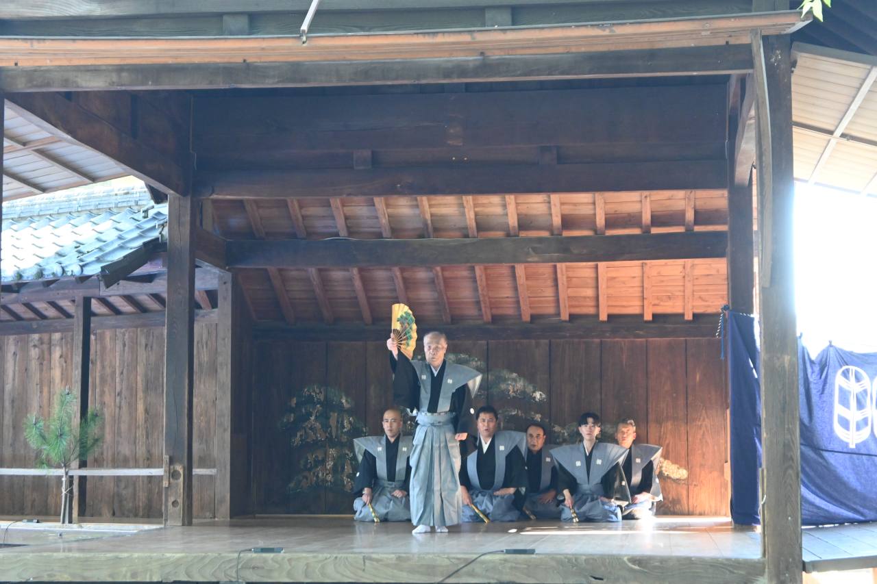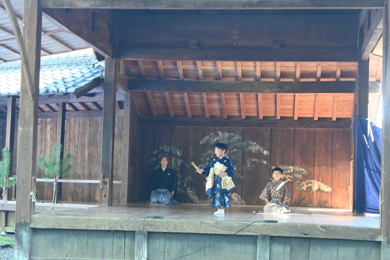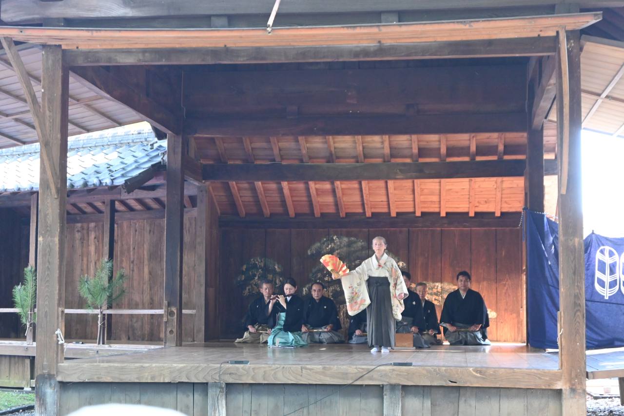 その後菊池神社による神事が執り行われたあと、菊池高等学校前にある熊本県指定有形民俗文化財「菊池松囃子能場」で、御松囃子御能保存会による御能が奉納されました。